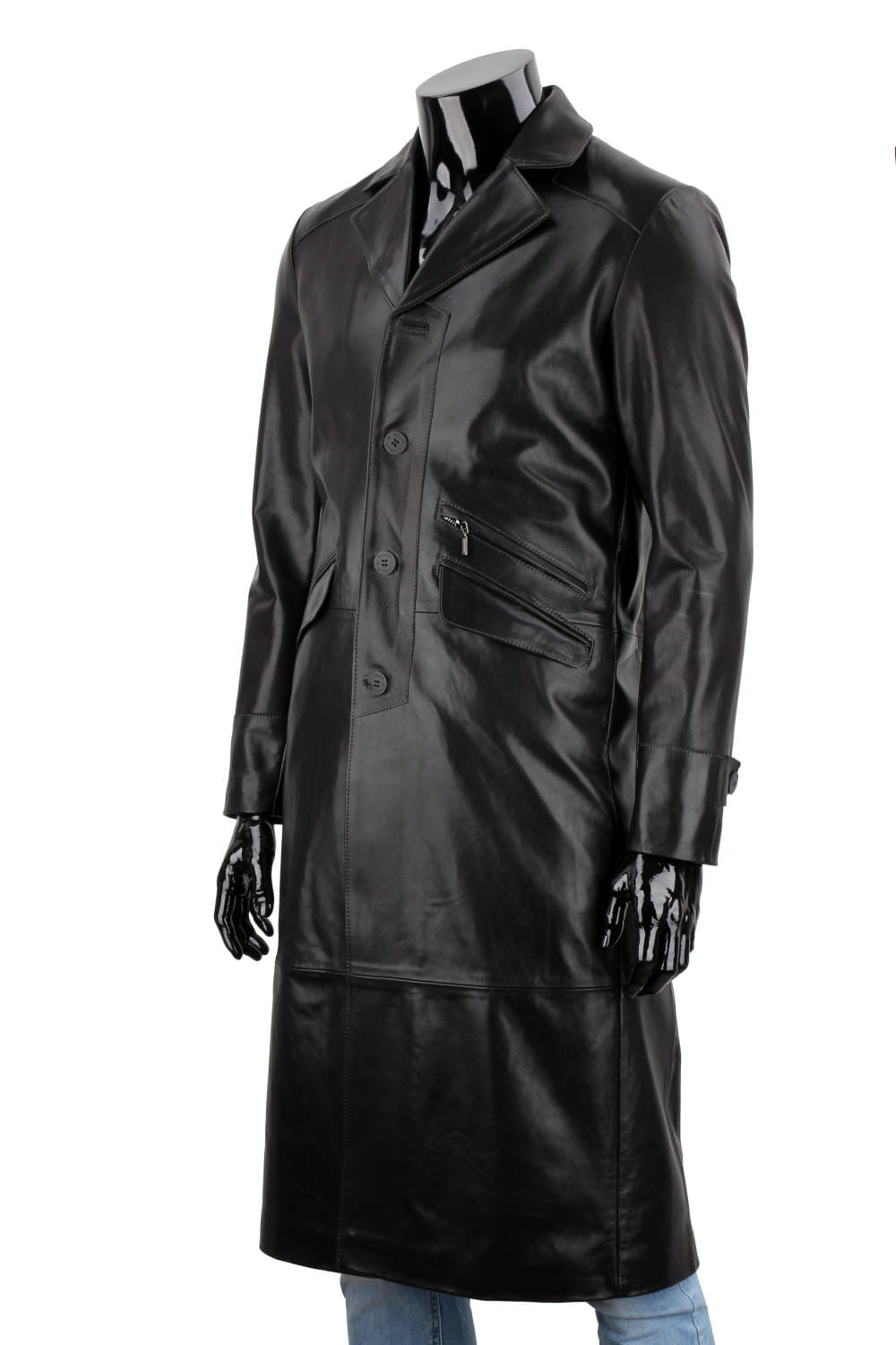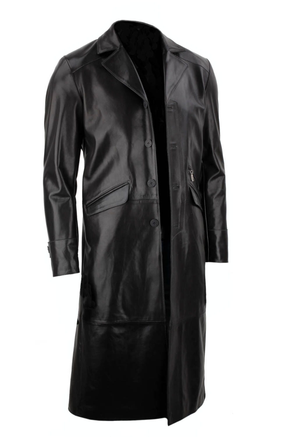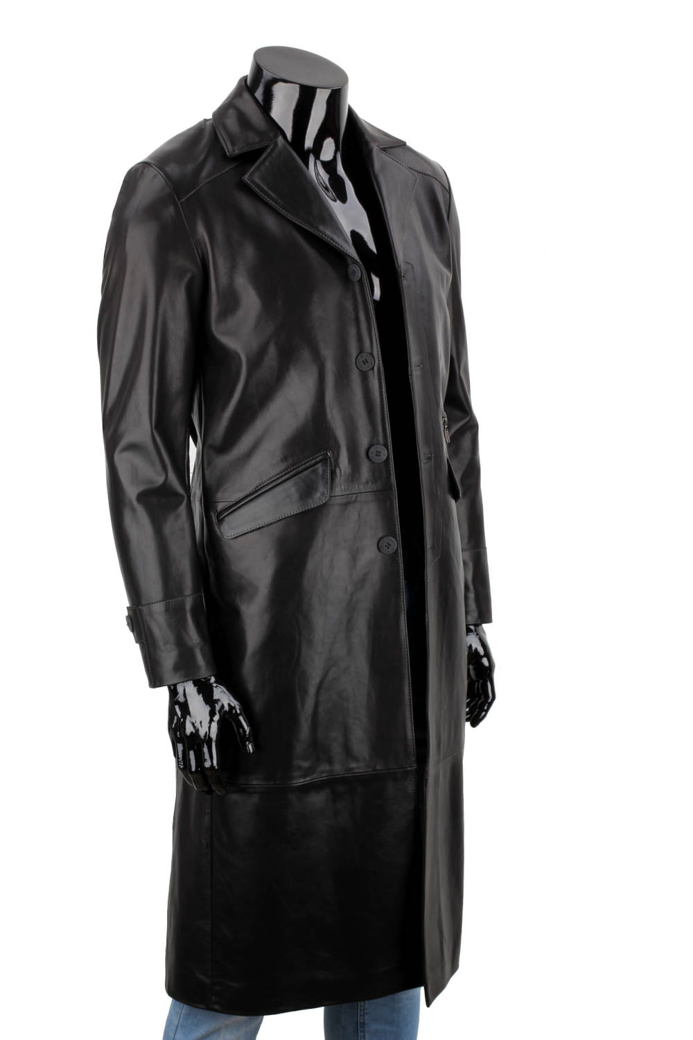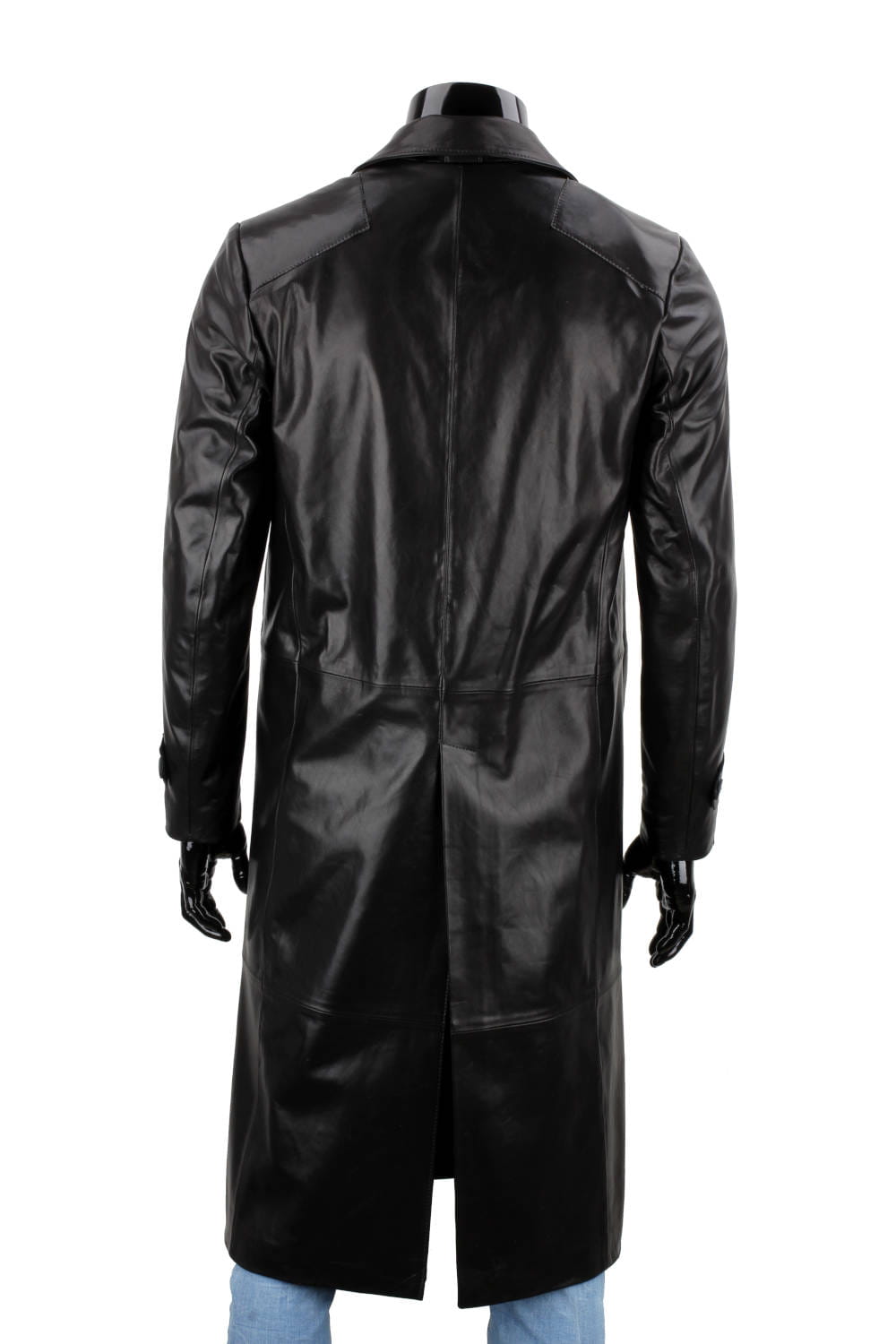 Klasyczny długi płaszcz męski skórzany z czarnej skóry
