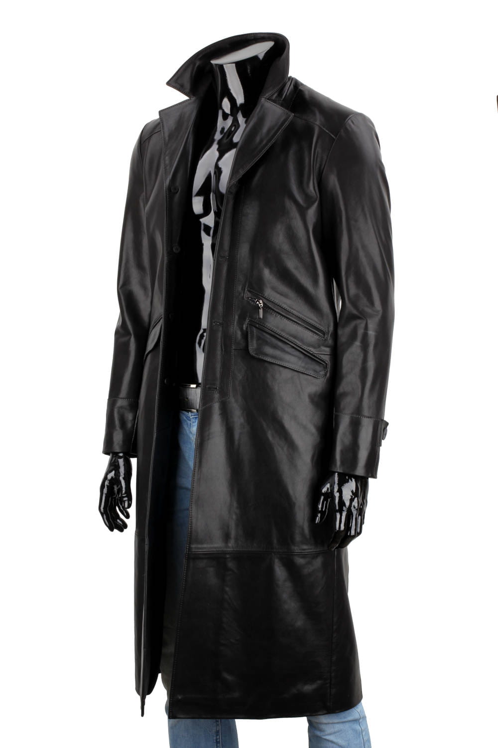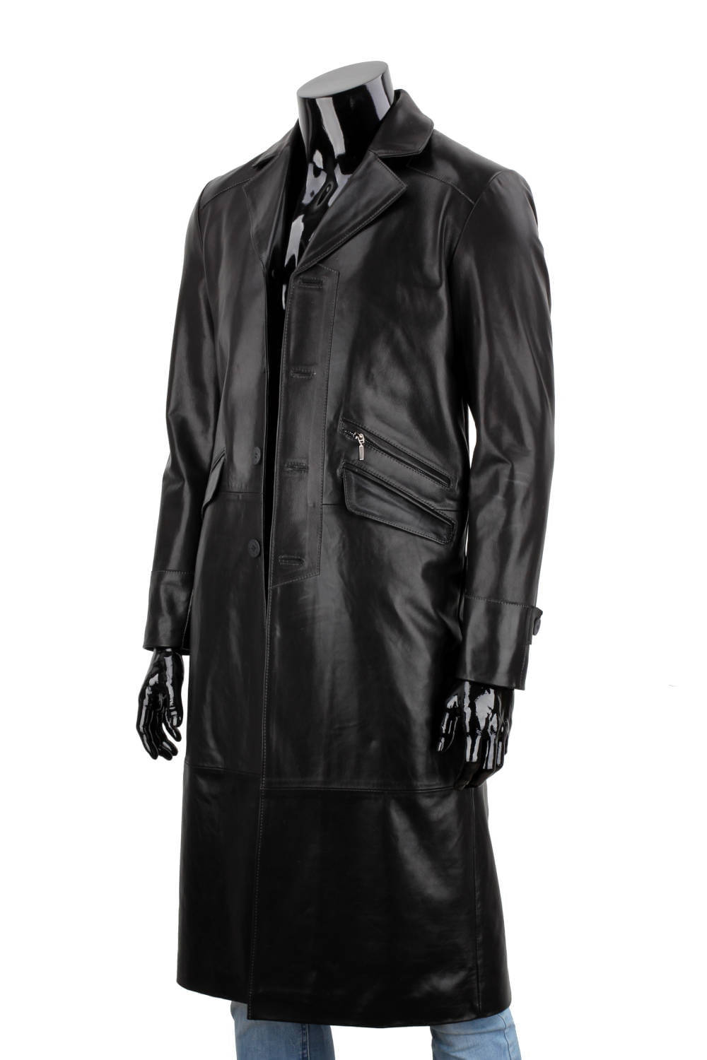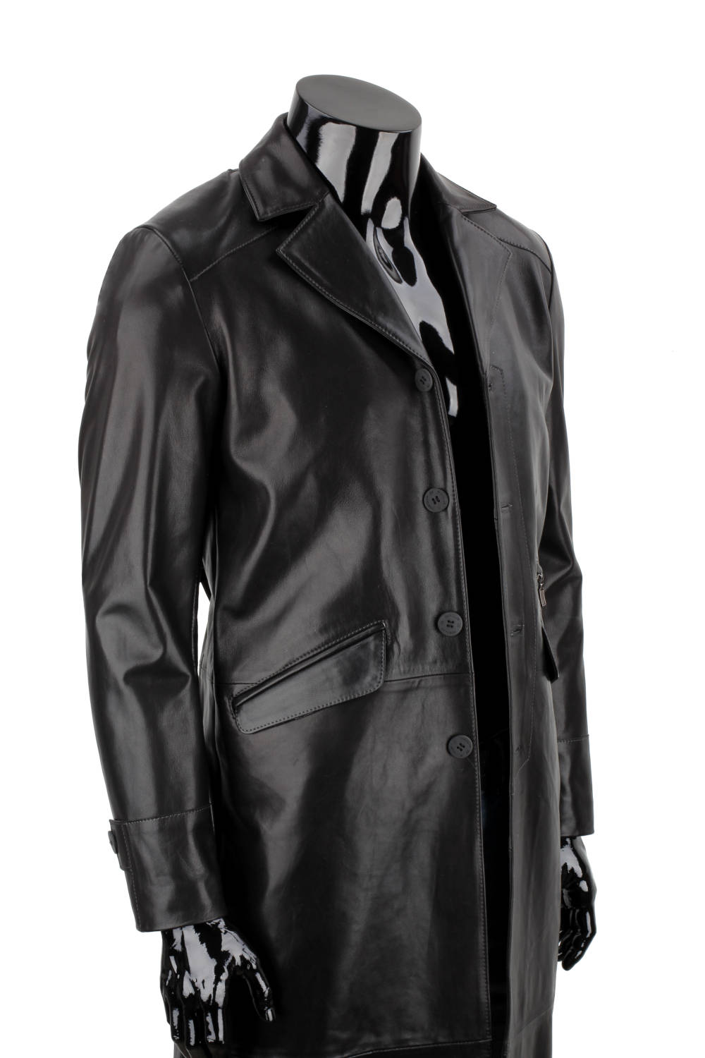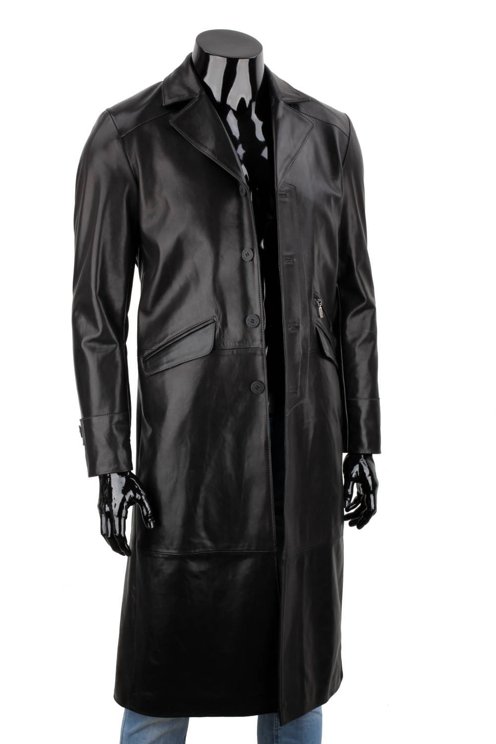 Klasyczny długi płaszcz męski skórzany z czarnej skóry